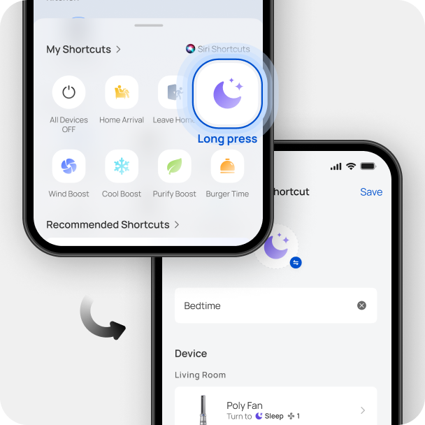 Add DREO Shortcuts to Siri*. Then you can use “Hey, Siri. [Shortcut name]” to control DREO products.