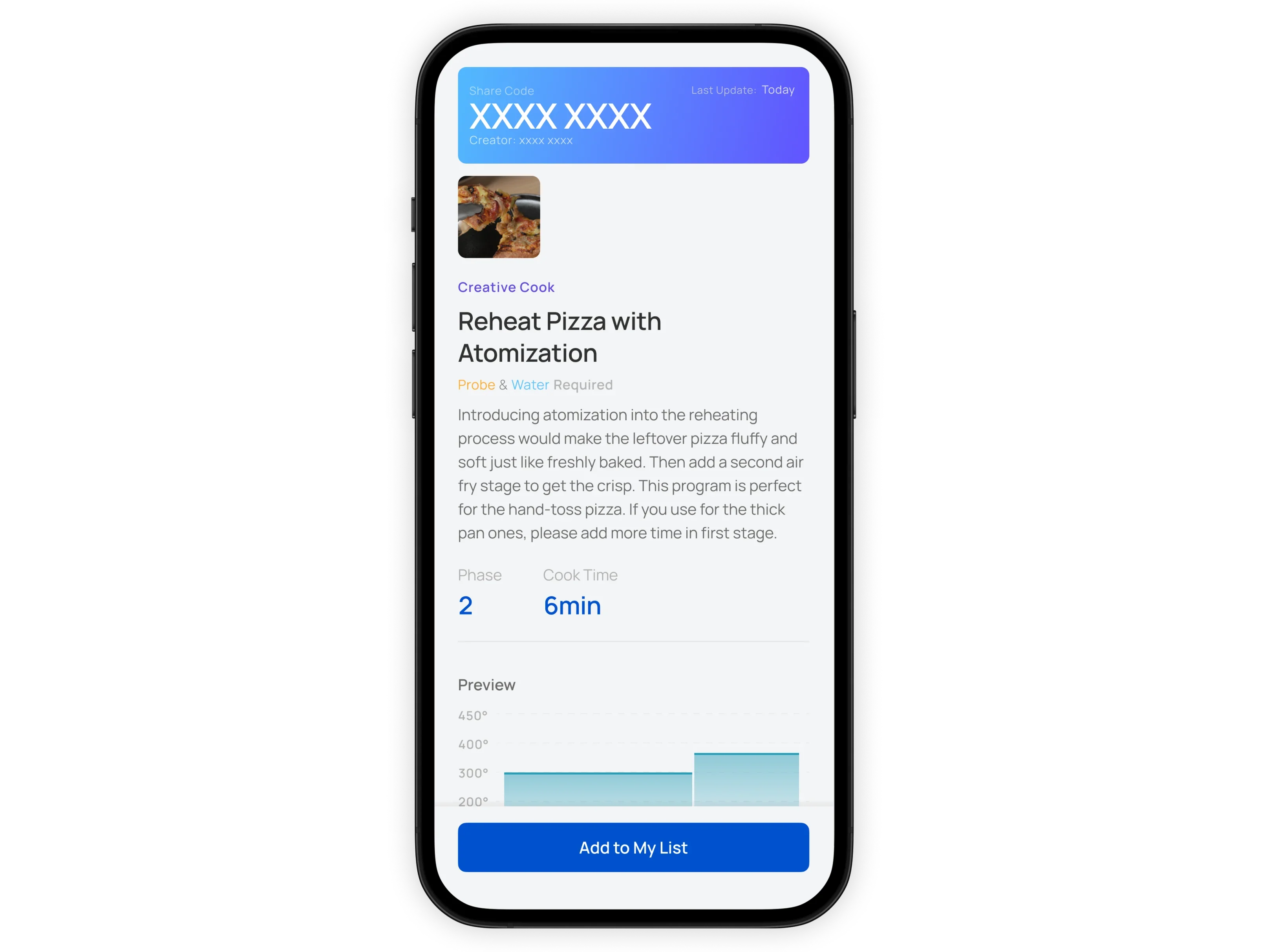 Introducing atomization into the reheating process would make the leftover pizza fluffy and soft just like freshly baked. Then add a second air fry stage to get the crisp. This program is perfect for the hand-toss pizza. If you reheat the thick pan/thin crust ones, please adjust the time in the first stage.
