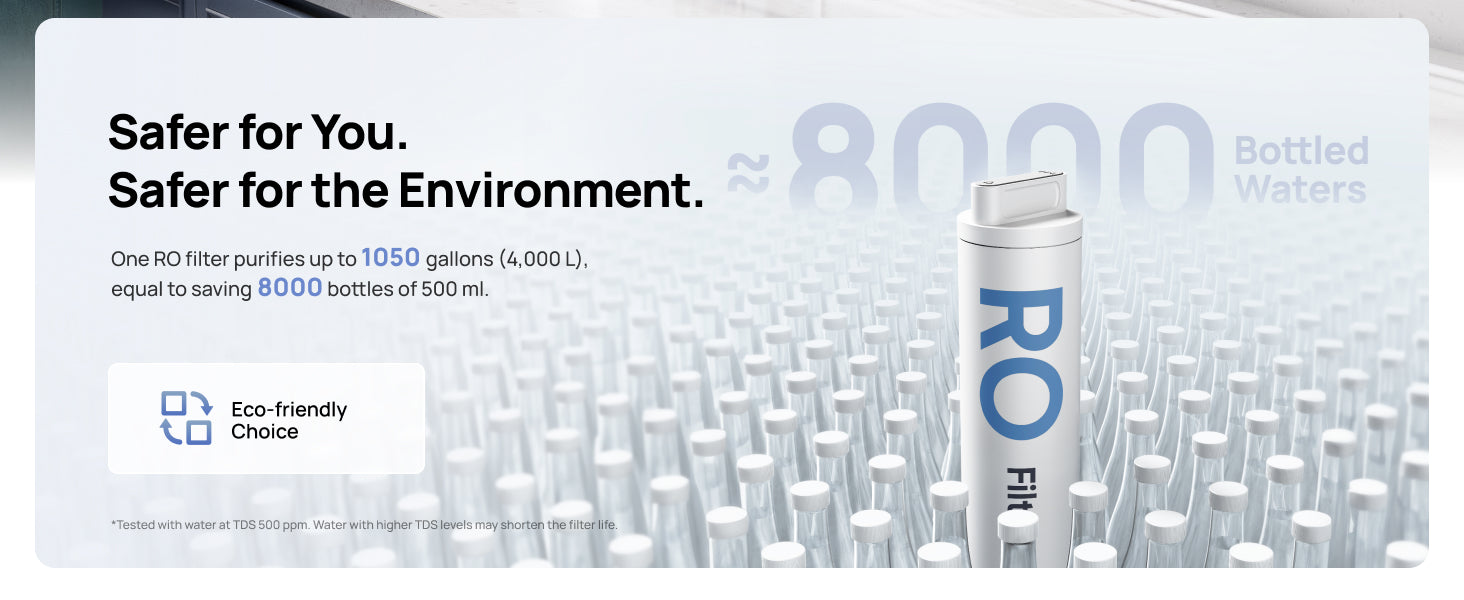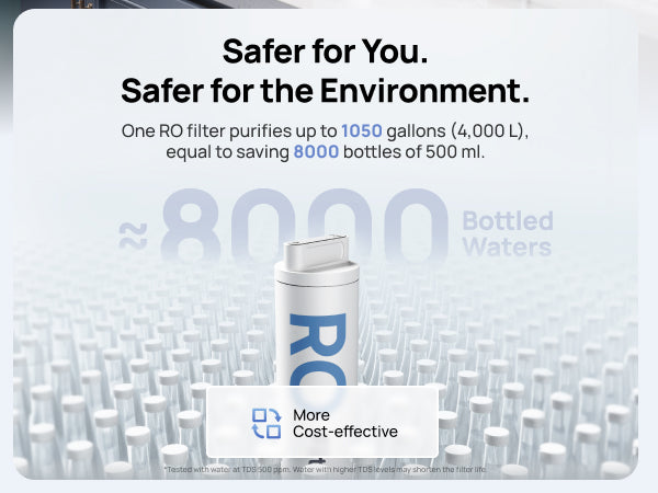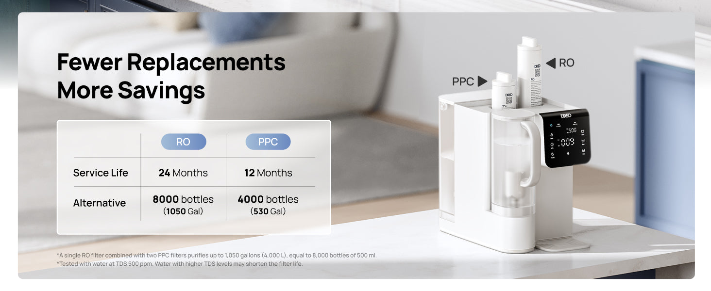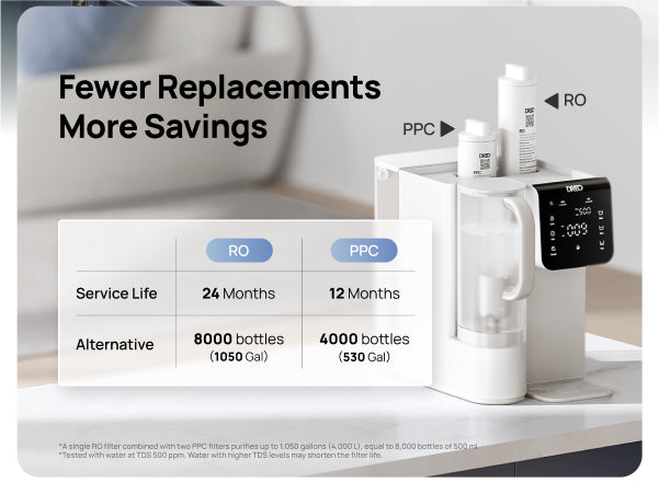 - ๐๐๐ค-๐๐ง๐๐๐ฃ๐๐ก๐ฎ & ๐พ๐ค๐จ๐ฉ-๐๐๐๐๐๐ฉ๐๐ซ๐: Our water filter system has a 3:1 pure-to-drain ratio, reducing water waste. RO and PPC filter combo purify up to 1,050 gallons, equal to 8,000 plastic bottles. With just 2 filters, maintenance is simple and affordable