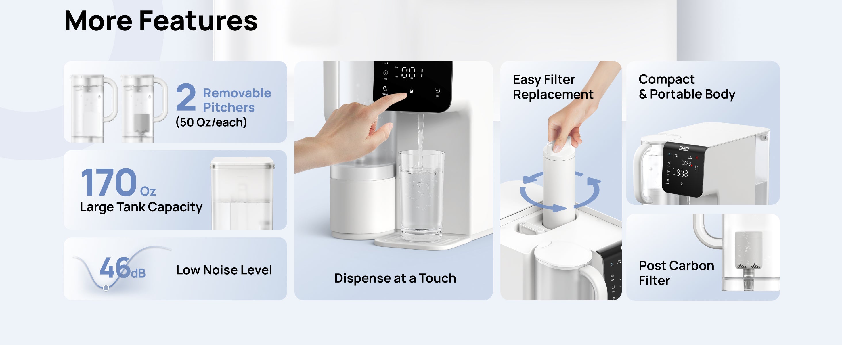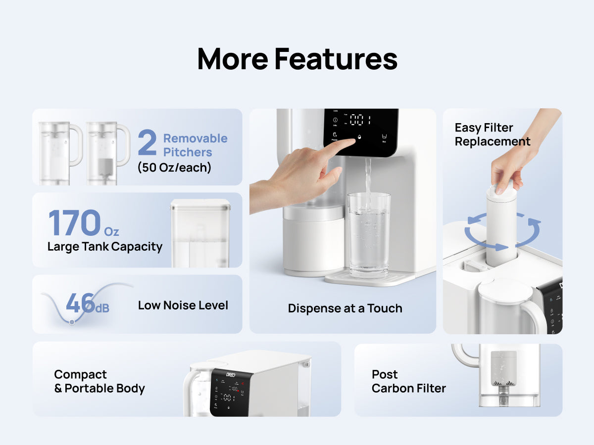 - ๐ฟ๐ง๐๐ฃ๐ ๐๐๐๐ฃ๐๐ซ๐๐ง, ๐๐๐๐ง๐๐ซ๐๐ง: Choose from one-touch dispensing or pour directly from the pitcher. The food-grade pitcher gives you freedom to drink as you like. Plus, you can take it on the go, while leaving the other pitcher to refill automatically