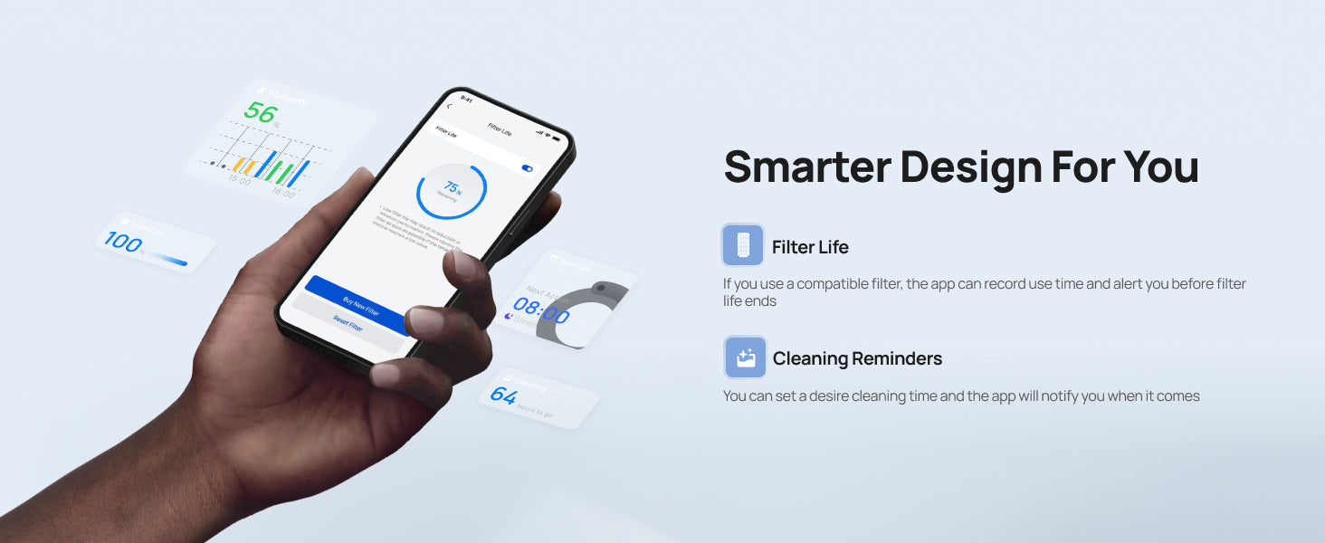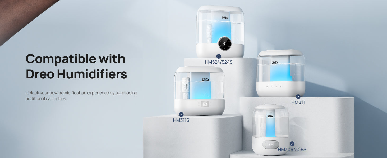 - 𝗠𝗼𝗿𝗲 𝗦𝘂𝘀𝘁𝗮𝗶𝗻𝗮𝗯𝗹𝗲: One cartridge can clear up to 150L of water. When connected to smart humidifiers, you can monitor the cartridge lifespan through the DREO app.