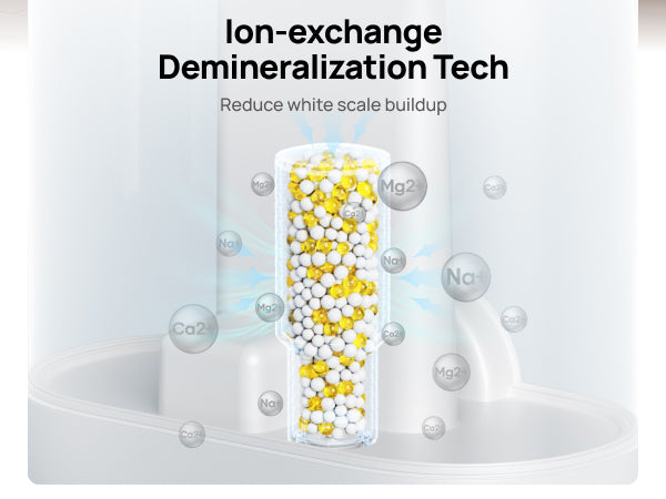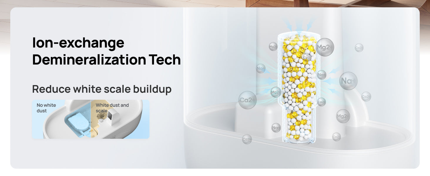 - Less White Dust, Easier to Clean: Avoid the formation of white dust inside the humidifier and around your furniture thanks to the ionic demineralization process.