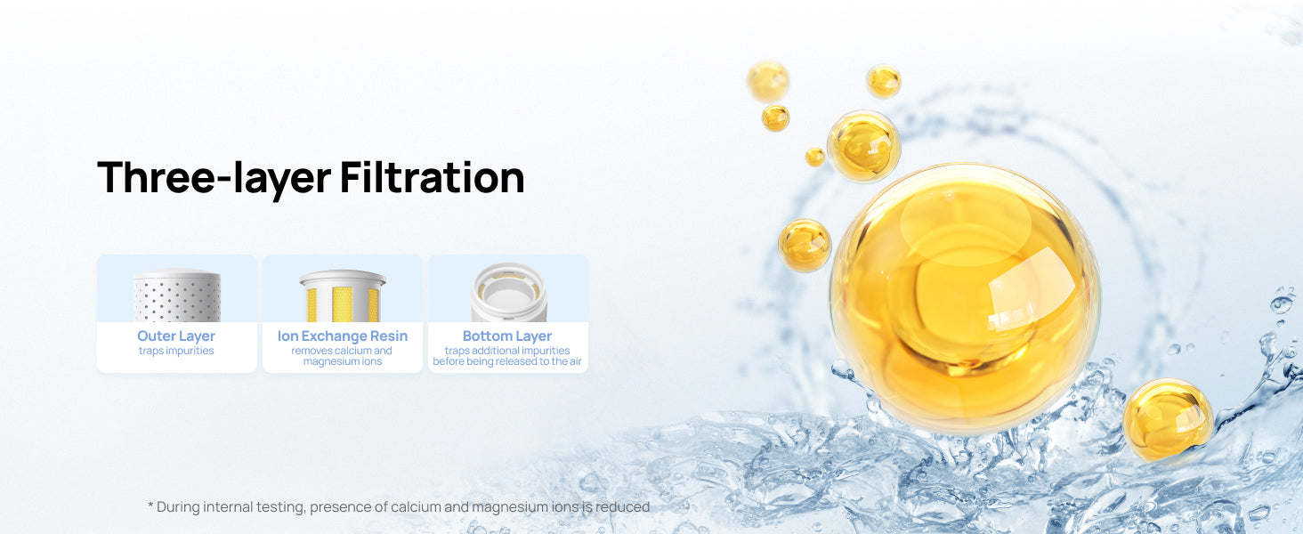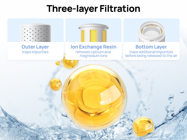- Ionic Demineralization: Using a large surface hydrogen resin and a 3-layer clearing system, this demineralization cartridge can neutralize heavy metals such as calcium and magnesium ions in water, reducing the white dust buildup of traditional humidifiers.