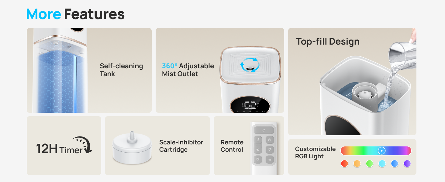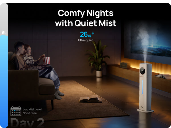 - Sleep mode at 26dB and RGB night light for a serene atmosphere.