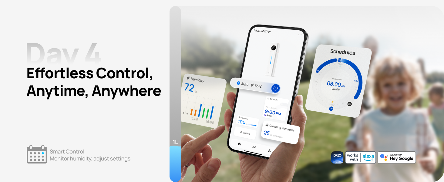 - Smart control via app or voice, with precise humidity adjustment.