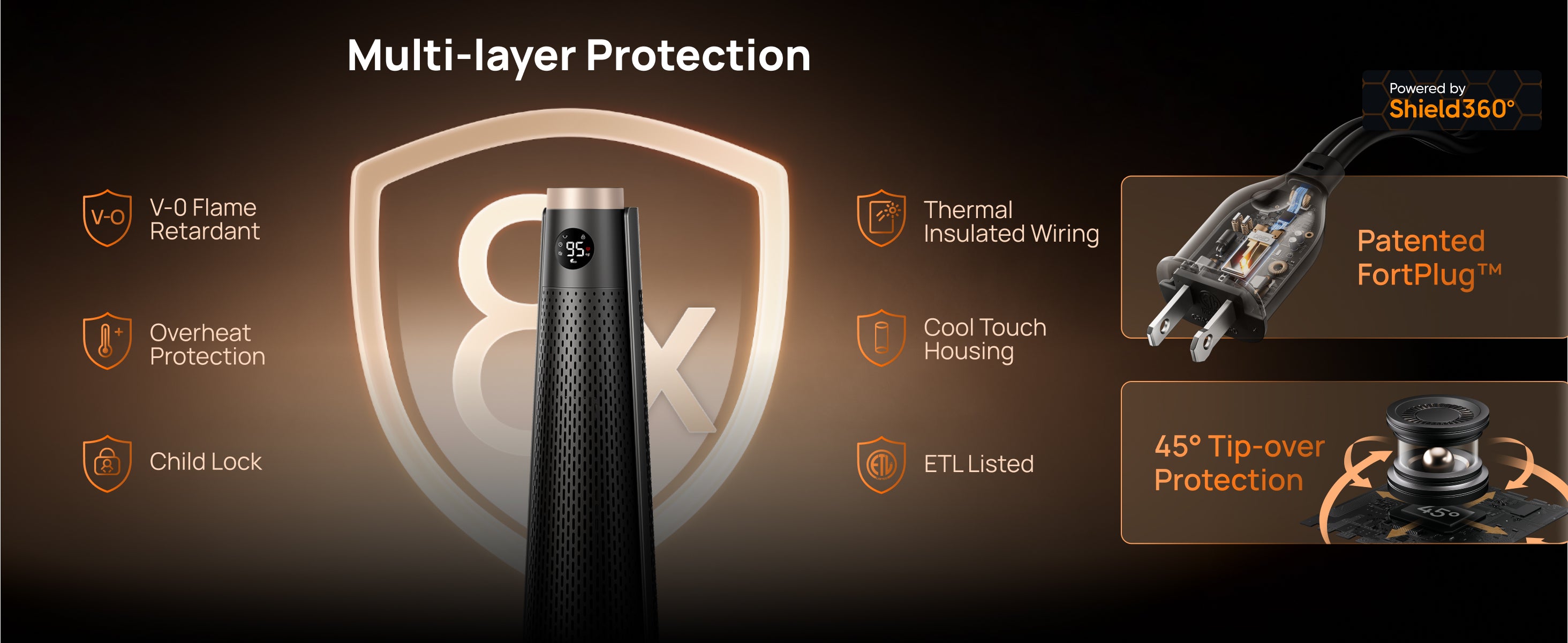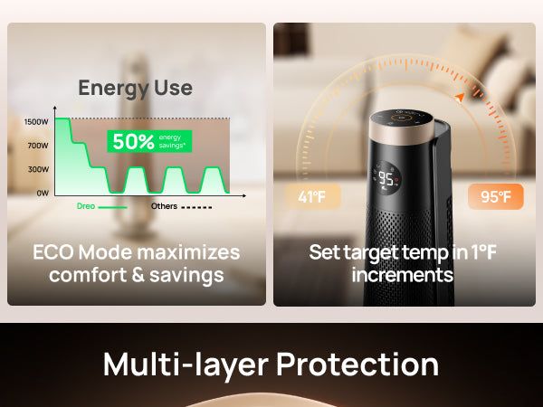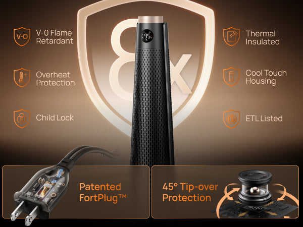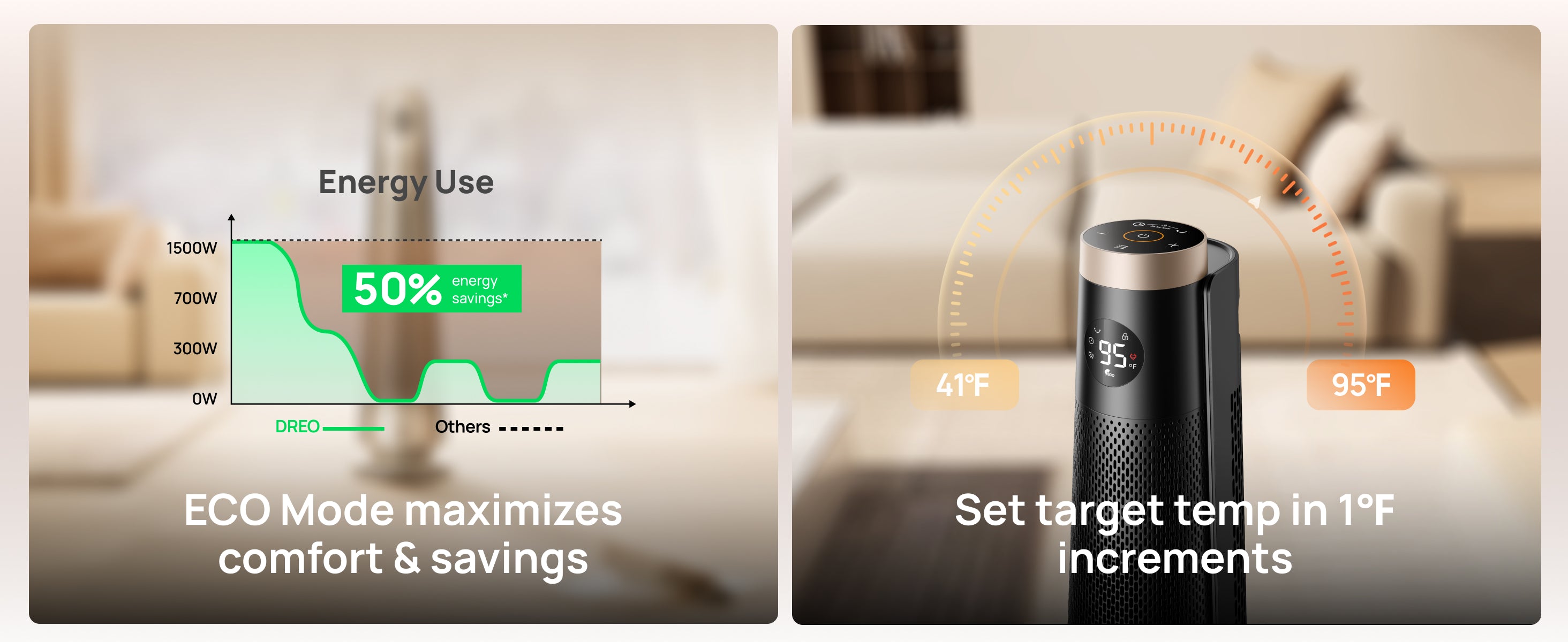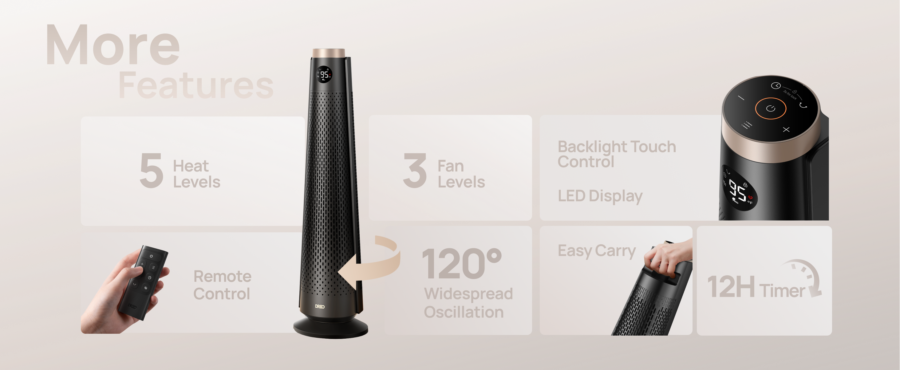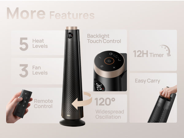 Special Feature: Energy Efficient, 120° Oscillating, Adjustable Temperature, Remote Control, Tip-Over Protection